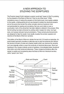 Details: Product Description The Prophet Joseph Smith declared a person would get nearer to God by abiding by the precepts of the Book of Mormon than by any other book. While considering ways of making the precepts of this divine book more readily available to the reader, a distinguishing format was devised to isolate the doctrinal precepts and at the same time render this rather complex volume of scripture more comprehensible for reading and pondering. Not one word, letter or even a punctuation mark of the actual text has been deleted or altered in the process. Only the formatting has been enhanced by adding wider margins for notes, two type sizes, and spaces between textual subdivisions. These contextual enhancements are designed to help the reader more readily visualize the context, speaker and doctrine of the Book of Mormon narrative. This edition of the Book of Mormon divides the text into 214 events or episodes. An event-based approach provides an alternate way to read the scripture text without the obvious intrusion of verse and chapter breaks which can obscure the narrative as it was originally written or even the continuity of doctrinal discourses. Short text headings in the margins indicate names of speakers, chronological dates, locational information and other scriptural references. These marginal annotations allow the reader to quickly and consistently place the Book of Mormon historical narrative within space and time. Review This formatted edition provides a superior way to understand the settings and context of the Book of Mormon text. --Dr. R. Kent Crookston, Professor and Dean (emeritus), Brigham Young University I highly recommend to all readers of the Book of Mormon, this innovative approach to studying the doctrines of Jesus Christ. --Dr. John P. Livingstone, Church History and Doctrine Religious Education (Emeritus), Brigham Young University About the Author Starting in the 1980s as a father and son team we developed and helped the Church publish the first online edition of the scriptures. Parallel to that project we considered ways to isolate the doctrinal precepts by reformatting the scriptures for easier reading and pondering. We also investigated ways to go beyond merely searching electronically for words in the text. We quickly discovered this reformatted edition emphasizing events rather than chapters was our preferred way to study. More than a decade in the making, A New Approach to Studying the Book of Mormon: Another Testament of Jesus Christ has been our labor of love. We are ever mindful of the long line of record keepers from Ether to Nephi to Mormon to Joseph Smith who have made this edition possible. We express appreciation to The Church of Jesus Christ of Latter-day Saints for providing a license to publish the text of the 2013 edition of the scriptures. We add our testimony to the millions before us that The Book of Mormon is a true account of the Nephite, Lamanite and Jaredite people, and its translation came by gift and power of God. We also testify The Book of Mormon is another testament of Jesus Christ and contains the gospel doctrines of salvation that lead to joy and happiness. Lynn A. Rosenvall David L Rosenvall